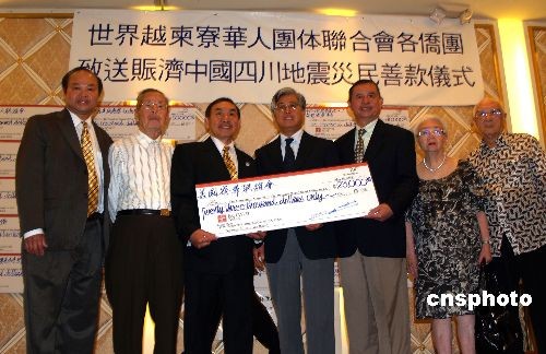 5月19日,世界越柬寮團(tuán)體聯(lián)合會(huì)600多位華人華僑在洛杉磯舉辦向汶川地震災(zāi)區(qū)募款活動(dòng),他們集體起立默哀3分鐘,現(xiàn)場(chǎng)募款50萬美金,當(dāng)即交由中國駐洛杉磯總領(lǐng)事館總領(lǐng)事張?jiān)?中)送汶川災(zāi)區(qū)。