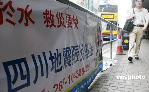 五月二十一日,香港市民走過街頭呼吁各界積極捐款,賑濟四川地震災民的橫幅。香港鳳凰衛(wèi)視此前報道稱,“有慈善捐款傳統(tǒng)的香港目前的捐款額,據(jù)說全部加起來已經(jīng)超過十五億港元,創(chuàng)下香港的紀錄!