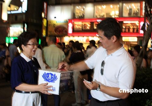 五月二十日晚,一名臺灣民眾在街頭見到為四川賑災(zāi)募捐的慈濟(jì)義工,毫不遲疑掏出一把鈔票塞入募捐箱。