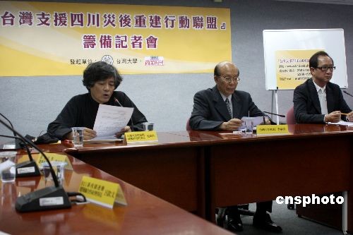 五月二十一日,臺灣大學與此間《商業(yè)周刊》發(fā)起成立“臺灣支援四川災后重建行動聯(lián)盟”。圖為臺灣大學校長李嗣涔(中)、臺大建筑系城鄉(xiāng)研究所所長夏鑄九(左一)、《商業(yè)周刊》發(fā)行人金惟純出席記者會。中新社發(fā) 陳立宇 攝