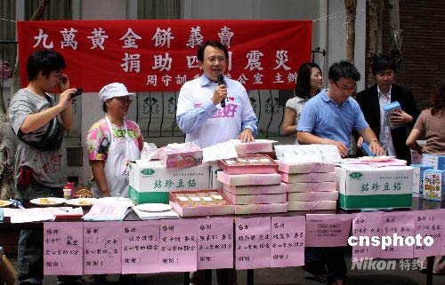 五月二十三日上午,國民黨“立委”周守訓(左三)與“牛媽媽公益之家”合辦(左二為牛媽媽),在臺灣“立法機關”內義賣黃金餅,收入將全部捐給臺灣紅十字會,作為四川震災后的重建基金,該活動得到不少“立委”和工作人員的支持。中新社發(fā) 陳立宇 攝