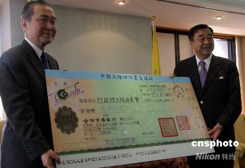 臺(tái)灣創(chuàng)價(jià)學(xué)會(huì)理事長林釗(左)五月二十三日在此間為四川震災(zāi)捐款新臺(tái)幣一百萬元。圖右為臺(tái)灣內(nèi)政部門負(fù)責(zé)人廖了以。汶川地震發(fā)生十余日,臺(tái)灣佛教團(tuán)體、企業(yè)界持續(xù)行動(dòng),并以“協(xié)助災(zāi)區(qū)安置及重建、教育的恢復(fù)工作”為目標(biāo)。中新社發(fā) 劉舒凌 攝