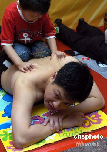 六月五日,香港一商場(chǎng)舉行“感恩父親節(jié)”活動(dòng),邀請(qǐng)幾名小朋友為父親擦背按摩,預(yù)祝甜蜜父親節(jié)的來(lái)臨。中新社發(fā) 譚達(dá)明 攝