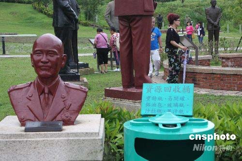 去年12月23日被臺(tái)灣民進(jìn)黨執(zhí)政當(dāng)局關(guān)閉的兩蔣陵寢,今年5月31日再度開放。作為兩蔣文化園區(qū)組成部分的慈湖雕塑公園內(nèi),目前陳列有臺(tái)灣各地機(jī)關(guān)學(xué)校送來的不同型式、不同材質(zhì)的蔣介石塑像一百四十一尊。圖為慈湖雕塑公園內(nèi)一尊蔣介石先生銅像與垃圾桶并列陳放,前來參觀的游客認(rèn)為此舉不嚴(yán)肅也不妥,他們希望管理部門應(yīng)該糾正。中新社發(fā) 耿軍 攝