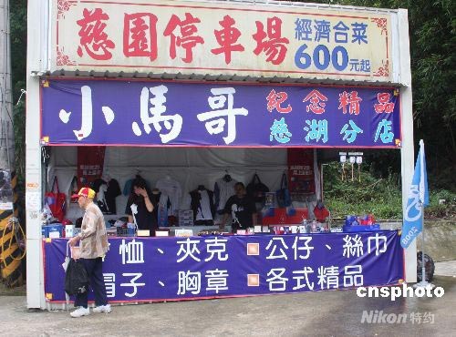 臺灣旅游業(yè)界為迎接大陸居民赴臺旅游,已開始做各項(xiàng)準(zhǔn)備工作。圖為臺灣桃園縣經(jīng)營旅游商品的商販,在慈湖蔣介石陵寢的路邊,設(shè)立了招攬大陸游客的、專售與馬英九相關(guān)的旅游紀(jì)念品的商棚。中新社發(fā) 耿軍 攝