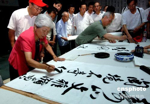 6月19日,參加海峽兩岸壽山石文化書(shū)法精品展的兩岸知名書(shū)法家,在福州博物館舉行交流筆會(huì)。圖為臺(tái)灣中國(guó)書(shū)法家學(xué)會(huì)理事長(zhǎng)謝季蕓女士(左一)、臺(tái)灣中國(guó)書(shū)法家學(xué)會(huì)副理事長(zhǎng)陳炫明在海峽兩岸書(shū)法家交流筆會(huì)上揮毫。中新社發(fā) 劉可耕 攝