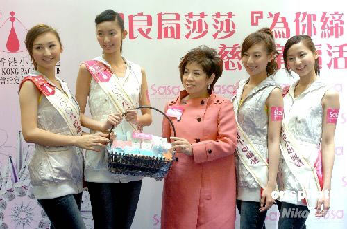 六月二十日,二零零八年香港小姐十二位候選佳麗,在香港出席保良局與莎莎化妝品公司合辦的“為你締造美麗人生”慈善義賣活動。同場一至四號候選佳麗文柏姿、倫紫玄、張舒雅、高海寧(右起)獲頒“最具智慧佳麗”獎項,由莎莎化妝品有限公司副主席郭羅桂珍頒贈獎品。中新社發(fā) 鄧慶樂 攝