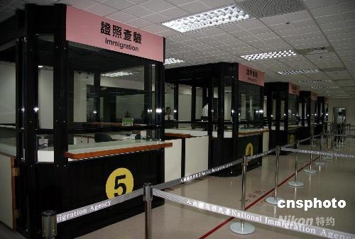 兩岸周末包機(jī)將于七月四日啟程,臺北松山機(jī)場當(dāng)日到港四班。為因應(yīng)周末包機(jī)需要,松山機(jī)場在二十多天時間內(nèi),基本完成了機(jī)場整修。圖為裝修一新的證照查驗(yàn)通道。中新社發(fā) 徐長安 攝
