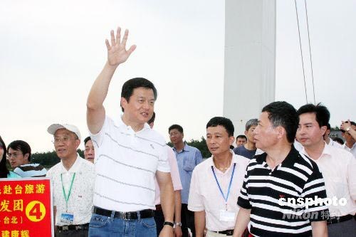 7月5日,大陸居民赴臺(tái)旅游首發(fā)團(tuán)抵臺(tái)第二天。臺(tái)北縣長(zhǎng)周錫瑋專程來(lái)到臺(tái)北縣古鎮(zhèn)淡水,對(duì)大陸游客表達(dá)歡迎,并親自為來(lái)自福建的旅游團(tuán)導(dǎo)覽淡水風(fēng)光漁人碼頭、情人橋等。中新社發(fā) 黃少華 攝