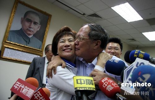7月26日傍晚,2008年中國(guó)國(guó)民黨中央常務(wù)委員選舉在臺(tái)北揭曉,40名登記參選者中有32人當(dāng)選。圖為國(guó)民黨中央黨部,獲選中常委的麗耿桂芳與丈夫厲威廉當(dāng)場(chǎng)擁吻,成為眾媒體焦點(diǎn)。中新社發(fā) 董會(huì)峰 攝