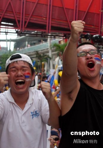 8月16日,征戰(zhàn)北京奧運的中華臺北棒球隊奮戰(zhàn)九局,0:1惜敗勁旅古巴,三連敗后出線前景渺茫。當日,數(shù)以千計的臺灣球迷聚集臺北東區(qū)觀看大屏幕直播,圖為現(xiàn)場兩名狂熱的年輕人。中新社發(fā) 董會峰 攝