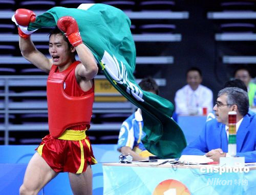 8月24日,在北京2008武術(shù)比賽男子70公斤級散手決賽中,中國澳門選手蔡良蟬(紅方)戰(zhàn)勝俄羅斯選手穆拉德·阿哈多夫,獲得冠軍。當(dāng)日,北京2008武術(shù)比賽落下帷幕。中新社發(fā) 宋吉河 攝
