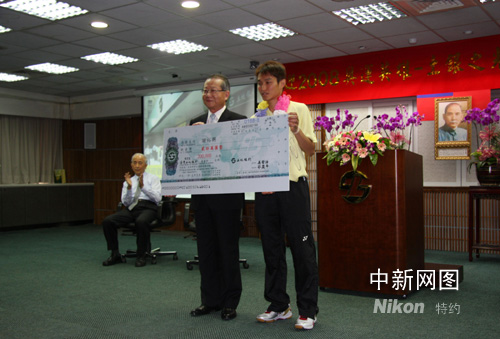 臺灣土地銀行27日舉行歡迎在北京奧運會上打進羽毛球男單八強,并列第五名的中華臺北隊隊員謝裕興返臺表揚會。謝裕興大學(xué)三年級時加入土地銀行羽毛球隊。圖為臺灣土地銀行董事長吳繁治向謝裕興(右一)頒發(fā)獎金,以資鼓勵。作者 陳立宇