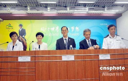 九月二日,香港特區(qū)政府就北京二零零八年殘奧馬術(shù)比賽項(xiàng)目的準(zhǔn)備工作舉行記者會(huì),香港民政事務(wù)局局長(zhǎng)曾德成、奧運(yùn)馬術(shù)公司行政總裁林煥光、香港殘疾人奧委會(huì)暨傷殘人士體育協(xié)會(huì)主席馮馬潔嫻、運(yùn)輸署助理署長(zhǎng)(新界)羅鳳屏和警察公共關(guān)系科總警司吳家聲向媒體公布相關(guān)事宜。中新社發(fā) 鄧慶樂(lè) 攝