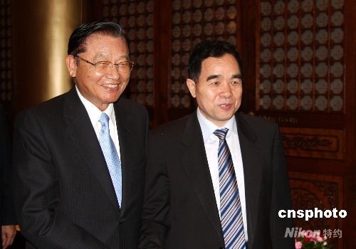 9月19日,臺灣;鶗麻L江丙坤在臺北圓山飯店,會見率團前來臺灣參加海峽兩岸出版交流二十周年紀念活動的部分大陸代表團成員時,與新聞出版署署長柳斌杰(右)在一起。中新社發(fā) 陳立宇 攝