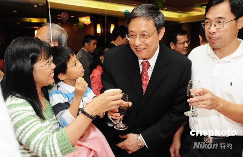 當?shù)貢r間9月21日晚,中國駐美大使周文重(講臺上)、公使劉光源(左一)夫婦、公使謝鋒夫人、總領事吳冬梅等參加當?shù)貎S學界慶祝中華人民共和國成立五十九周年晚會。周文重在晚會上致詞說,建國以來尤其是改革開放30年來,中國建設成就輝煌,2008年的中國經(jīng)受了各種嚴峻的考驗,兩岸關(guān)系出現(xiàn)了新的轉(zhuǎn)機,中華民族復興正面臨難得的歷史機遇。中新社發(fā) 邱江波 攝