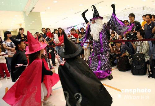 十月七日,香港海港城舉行迎接萬圣節(jié)活動,一群調皮的小朋友與魔法師跳舞狂歡,營造氣氛。中新社發(fā) 洪少葵 攝