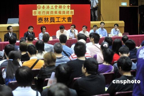 十月二十日,香港工聯(lián)會早上安排泰林員工與臨時清盤人開會,大約二百多人出席。香港有六十二年歷史的泰林電器日前全線結(jié)業(yè),受影響的員工被拖欠的薪金及遣散費,初步估計多達(dá)一千萬港元。中新社發(fā) 譚達(dá)明 攝