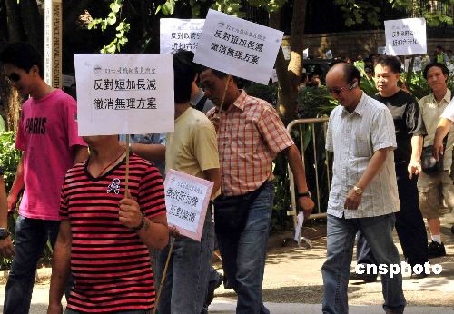 十月二十八日,香港逾百名的士司機到立法會外請愿,要求撤銷“短加長減”方案。方案將市區(qū)的士起價由十六元加至十八元,而乘搭的士長途車,則只需支付現(xiàn)時約八折的車資。中新社發(fā) 譚達明 攝