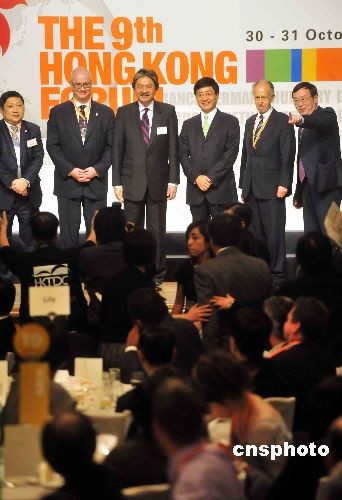 十月三十日,香港財政司司長曾俊華(左三)出席第九屆香港論壇的歡迎午宴。香港論壇由貿(mào)發(fā)局主辦,旨在協(xié)助香港公司拓展關(guān)系,促成合作。中新社發(fā) 譚達明 攝