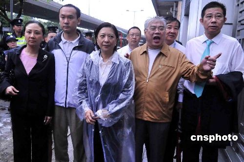 十一月三日,香港民建聯(lián)副主席蔣麗蕓(右三)及立法會(huì)議員黃定光(右二),與幾十名中小企的代表早上由遮打花園游行至政府總部,他們不滿銀行縮減信貸額,令營運(yùn)資金緊絀,難以周轉(zhuǎn)。中新社發(fā) 譚達(dá)明 攝