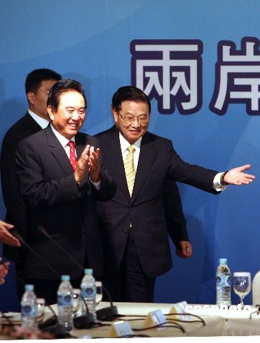 十一月五日上午,兩岸工商及航運(yùn)座談會(huì)在臺(tái)北圓山飯店舉行。海協(xié)會(huì)會(huì)長(zhǎng)陳云林、;鶗(huì)董事長(zhǎng)江丙坤一同出席座談會(huì)。中新社發(fā) 洪少葵 攝