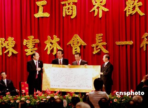 11月6日,臺灣工商界在臺北圓山飯店設午宴歡迎海協會會長陳云林一行。臺灣工商界人士稱贊此次簽署的四項協議,幾乎每一件都關系工商業(yè)界的發(fā)展。從中小企業(yè)到大企業(yè),從傳統產業(yè)到高科技產業(yè),兩岸工商界交流朝著良性、全面性發(fā)展。中新社發(fā) 黃少華 攝