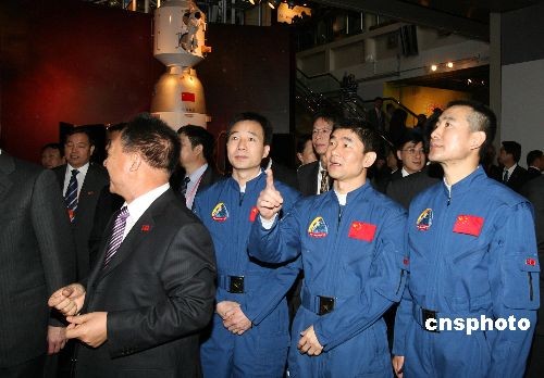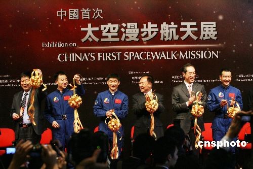 十二月六日,“中國(guó)首次太空漫步航天展”在香港科學(xué)館揭幕,神舟七號(hào)返回艙、航天服和航天員出艙后所展示的國(guó)旗等珍貴展品和圖片在展會(huì)上亮相。香港特區(qū)政府政務(wù)司司長(zhǎng)唐英年、神舟七號(hào)載人航天飛行赴港代表團(tuán)團(tuán)長(zhǎng)暨中國(guó)載人航天工程副總指揮張建啟、神七航天員翟志剛、劉伯明、景海鵬等出席揭幕儀式。中新社發(fā) 武仲林 攝