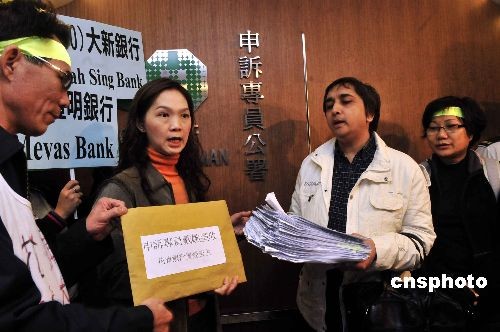 十二月十二日,香港數(shù)百名購(gòu)買了雷曼相關(guān)產(chǎn)品的市民發(fā)起游行。圖為苦主代表向申訴專員公署投訴金融管理局監(jiān)管不力。中新社發(fā) 譚達(dá)明 攝