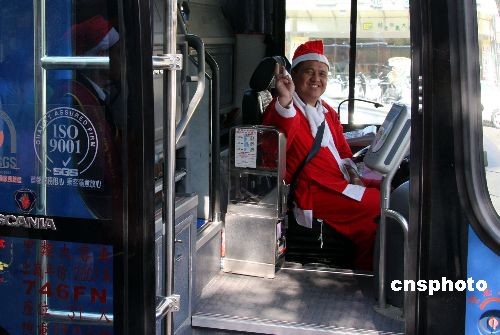 圣誕節(jié)將至,臺(tái)北市有的客車司機(jī)穿上了圣誕老人的服飾,以活躍氣氛。圖為12月20日,一輛長(zhǎng)途客車的司機(jī)正準(zhǔn)備載客出發(fā)。中新社發(fā) 陳立宇 攝