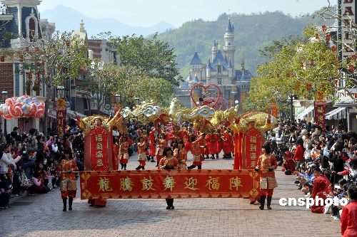 一月十五日,香港迪斯尼樂(lè)園為迎接農(nóng)歷新年來(lái)臨,特別舉行〝福到滿城賀金牛〞大型巡游。中新社發(fā) 鄧慶樂(lè) 攝