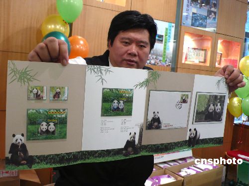1月20日,為慶祝大陸贈(zèng)臺(tái)兩只大熊貓“團(tuán)團(tuán)”“圓圓”到臺(tái)灣落戶,臺(tái)灣“中華郵政”舉行“可愛動(dòng)物郵票——大熊貓”郵票及郵折發(fā)行典禮。本次發(fā)行的大熊貓郵票一組含郵票兩枚及小型張一張,分別為大熊貓團(tuán)團(tuán)(面值新臺(tái)幣五元)、圓圓(面值九元)和團(tuán)團(tuán)圓圓小型張(面值二十五元),各發(fā)行一百萬張!翱蓯蹌(dòng)物郵票——大熊貓”郵折一本,內(nèi)含上述大熊貓郵票一組、小型張樣張一張、貼有團(tuán)團(tuán)郵票的首日封及原圖明信片一組三張,每本售價(jià)新臺(tái)幣一百八十元,限量二萬五千套。中新社發(fā) 路梅 攝