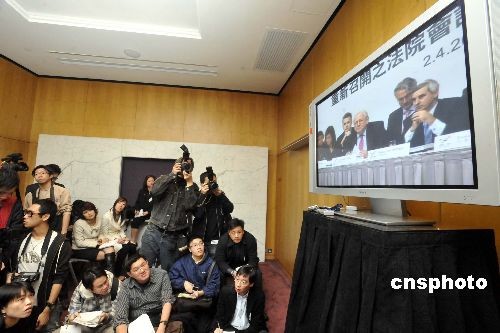二月四日,電訊盈科在香港會議展覽中心舉行股東特別大會表決私有化議案。圖為媒體只能在會場外一個房間透過大會安排電視轉(zhuǎn)播關(guān)注場內(nèi)會議情況。中新社發(fā) 鄧慶樂 攝