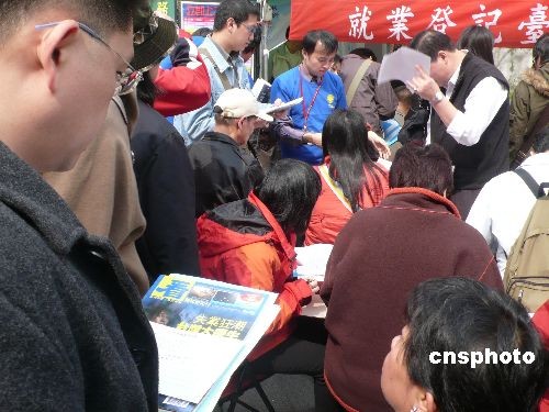 大環(huán)境經(jīng)濟(jì)不景氣,臺灣去年十二月失業(yè)率超過百分之五,失業(yè)人口近五十無萬!爸饔(jì)處”對今年經(jīng)濟(jì)成長率的預(yù)測為負(fù)百分之二點(diǎn)九七。臺北市政府勞工局在二十一日舉行了一場就業(yè)博覽會,釋出兩千多個工作職位,并提供職業(yè)訓(xùn)練課程供民眾申請。中新社發(fā) 路梅 攝