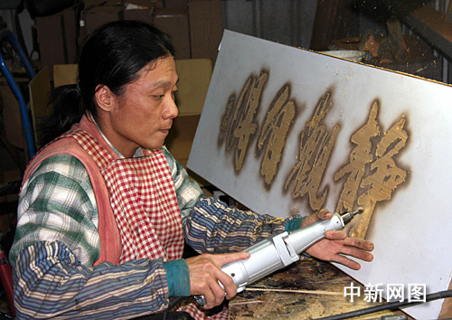 面對罕見金融危機沖擊引發(fā)的失業(yè)潮。身有殘障的臺灣知名木雕家林正發(fā)并沒氣餒,而是自食其力。圖為林正發(fā)正在自己的工作室中制作承接的牌匾,掙錢糊口。陳立宇 攝