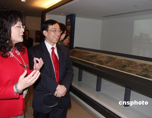 2月26日,上海博物館館長陳燮君(中)一行應(yīng)邀抵達(dá)臺(tái)北參訪。圖為陳燮君一行在臺(tái)北故宮參觀,聽工作人員介紹結(jié)合了聲光效果的《清明上河圖》復(fù)制品。中新社發(fā) 路梅 攝