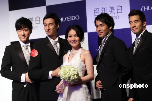 三月二日,香港天后級(jí)歌星楊千嬅為日本某著名美容品牌擔(dān)任形象大使。圖為悉心打扮的楊千嬅在一眾型男模特的襯托下,靚麗登場(chǎng)。中新社發(fā) 洪少葵 攝