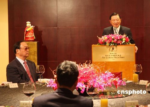 大陸海協(xié)會(huì)副會(huì)長(zhǎng)安民四月六日率“海協(xié)會(huì)經(jīng)貿(mào)交流考察團(tuán)”一行十四人抵達(dá)臺(tái)灣,開始為期七天的訪問(wèn)。臺(tái)灣海基會(huì)董事長(zhǎng)江丙坤在香格里拉臺(tái)北遠(yuǎn)東國(guó)際大飯店宴請(qǐng)安民一行。 中新社發(fā) 耿軍 攝