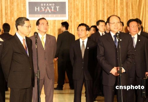 大陸海協(xié)會(huì)協(xié)商代表團(tuán)一行四月十七日下午抵達(dá)臺(tái)北。圖為代表團(tuán)入住君悅大飯店時(shí),臺(tái)灣;鶗(huì)副董事長(zhǎng)高孔廉(左一)在大堂迎候。海協(xié)會(huì)常務(wù)副會(huì)長(zhǎng)鄭立中(右二)、副會(huì)長(zhǎng)李炳才(右三)、李亞飛(右一)與等候的媒體記者見面,鄭立中發(fā)表簡(jiǎn)短談話。中新社發(fā) 耿軍 攝