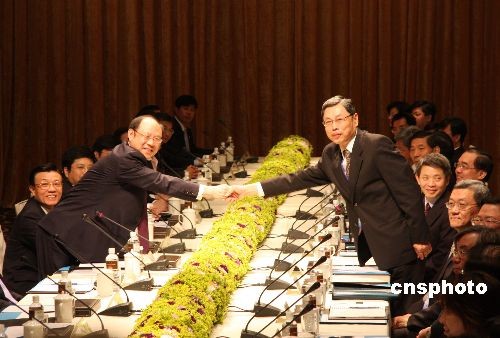 四月十八日,海協(xié)會(huì)與;鶗(huì)在臺(tái)北君悅飯店三樓就兩會(huì)領(lǐng)導(dǎo)人第三次會(huì)談的相關(guān)事宜進(jìn)行預(yù)備性磋商。圖為會(huì)談開(kāi)始時(shí)海協(xié)會(huì)副會(huì)長(zhǎng)鄭立中(左)與海基會(huì)副董事長(zhǎng)高孔廉握手。中新社發(fā) 耿軍 攝