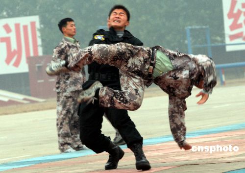 中國武警部隊(duì)特勤大隊(duì)11月12日上午在北京舉行摔擒演練等訓(xùn)練科目表演。來自42個(gè)國家的59名駐華武官,參觀了這次武警官兵表演的搏擊拳、射擊、一招制敵、戰(zhàn)術(shù)基礎(chǔ)動(dòng)作、五人戰(zhàn)斗小組情況處置演練、公共汽車反劫持等訓(xùn)練科目表演,并參觀了大隊(duì)部分武器裝備。這支組建于2002年12月的部隊(duì),是美國“9·11”事件后,中國為防范和打擊恐怖主義而專門組建的反恐特種部隊(duì),共四百余人,主要擔(dān)負(fù)處置重大恐怖事件中心區(qū)武力突擊任務(wù)。他們先后四次參加國家級(jí)反恐綜合演習(xí),并參加了“合作-二00七”中俄聯(lián)合反恐演習(xí),目前已初步具備了反恐制勝的作戰(zhàn)能力。中新社發(fā) 宋吉河 攝