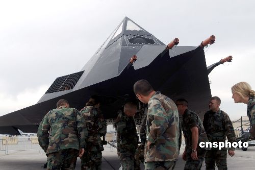 美國(guó)為紀(jì)念六十年前成立空軍,十一月在內(nèi)華達(dá)州的內(nèi)利斯空軍基地舉辦大規(guī)模飛機(jī)展示,美軍人員貼身參觀(guān)世界上第一種可正式作戰(zhàn)的隱型戰(zhàn)斗機(jī)F-117A“夜鷹”,此極專(zhuān)門(mén)用于夜間攻擊。中新社發(fā) 賈國(guó)榮 攝
