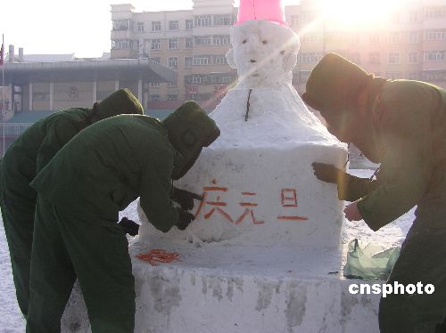 12月31日,新疆公安邊防官兵冒著零下20多度的溫度堆起雪雕,喜迎元旦新年的到來。中新社發(fā) 韓廣寧 攝