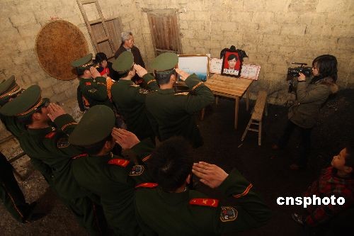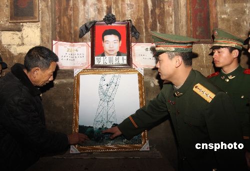 2月20日,武警湖南總隊婁底市支隊官兵來到湖南省漣源市白馬鎮(zhèn)楊世村,給在除冰搶險中英勇殉職的電力英雄羅長明、羅海文烈士家屬送去了湯圓、水果、慰問金等元宵節(jié)禮物。當(dāng)天,剛剛從搶修500千伏的五民線路(英雄生前搶修過的電網(wǎng))歸來的武警婁底市支隊官兵來到烈士家中。向烈士遺像前深深鞠躬,送來了一份特殊的慰問禮物——兩幅用鏡框鑲嵌裱好的照片,這正是烈士生前搶修電網(wǎng)時倒塌的43號鐵塔。英雄辭世后,武警官兵接過烈士手中的槍,繼續(xù)英雄生前未盡的事業(yè),經(jīng)過十幾天的緊急搶修,現(xiàn)在43號鐵塔重新矗立,整條線路順利通電。中新社發(fā) 郭國權(quán) 攝