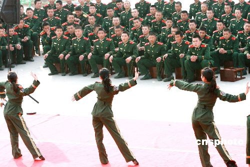 2月22日,武警江蘇總隊文工團演員為蘇州武警官兵表演舞蹈。當日,武警江蘇總隊政治部文工團組織“慰問抗雪救災一線官兵及新戰(zhàn)友專場文藝巡演”之首場演出活動,在蘇州武警支隊新兵營訓練場熱鬧開演。中新社發(fā) 蘇秀 攝