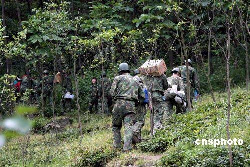 5月18日,中共中央總書記胡錦濤在北川視察災(zāi)情時,聽說鎣華鎮(zhèn)北門村麻柳坪道路至今沒有打通,災(zāi)民生活十分困難,當(dāng)即要求空軍派兵支援。中國空軍125名空降兵精干小分隊帶著食物、藥品徙步32公里,冒著不斷發(fā)生的余震、通過37處滑波,第一個進(jìn)入海拔1200多米的麻柳坪。圖為空降兵首批小分隊扛著藥品食物、冒著高溫向麻柳坪開進(jìn)的情景。中新社發(fā) 譚超 攝