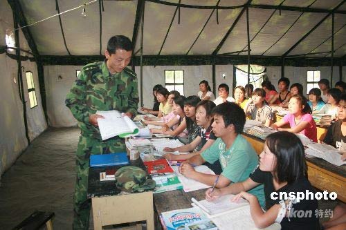 5月25日,蘭州軍區(qū)部隊(duì)官兵為文縣中廟鄉(xiāng)災(zāi)區(qū)學(xué)生上課。地震使該鄉(xiāng)多所學(xué)校倒塌,學(xué)生無法正常上課。部隊(duì)從官兵中抽調(diào)大學(xué)生,在部隊(duì)駐地搭建帳篷,為100多名中小學(xué)生上課。中新社發(fā) 劉二銀 攝
