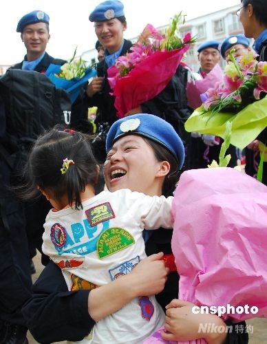 8月15日上午,中國(guó)第六支赴海地維和警察防暴隊(duì)95名隊(duì)員飛抵昆明巫家壩國(guó)際機(jī)場(chǎng),加上此前已經(jīng)回國(guó)的30名先遣隊(duì)員,這支由125名隊(duì)員組成的隊(duì)伍圓滿完成為期8個(gè)月的聯(lián)合國(guó)海地任務(wù)區(qū)維和任務(wù),胸掛聯(lián)合國(guó)“和平勛章”凱旋回國(guó)。中新社發(fā) 甘娜 攝