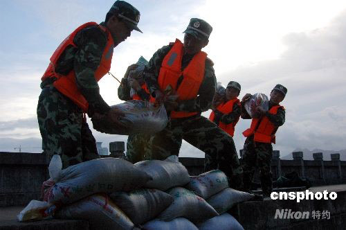 9月12日,溫州邊防官兵在緊張有序地搬運防臺沙袋。今年第13號強臺風“森拉克”逐漸向浙江沿海逼近,溫州市邊防支隊迅速啟動強臺風工作預案,組織官兵對沿海沿江堤壩進行加高加固,全力做好抗臺防汛準備工作。中新社發(fā) 吳水斌 攝