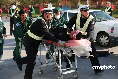 10月21日,新疆高等級公路交警支隊進行建隊十年來規(guī)模最大的一次快速應(yīng)對高速路突發(fā)事件演習(xí)。中新社發(fā) 宋大勇 攝